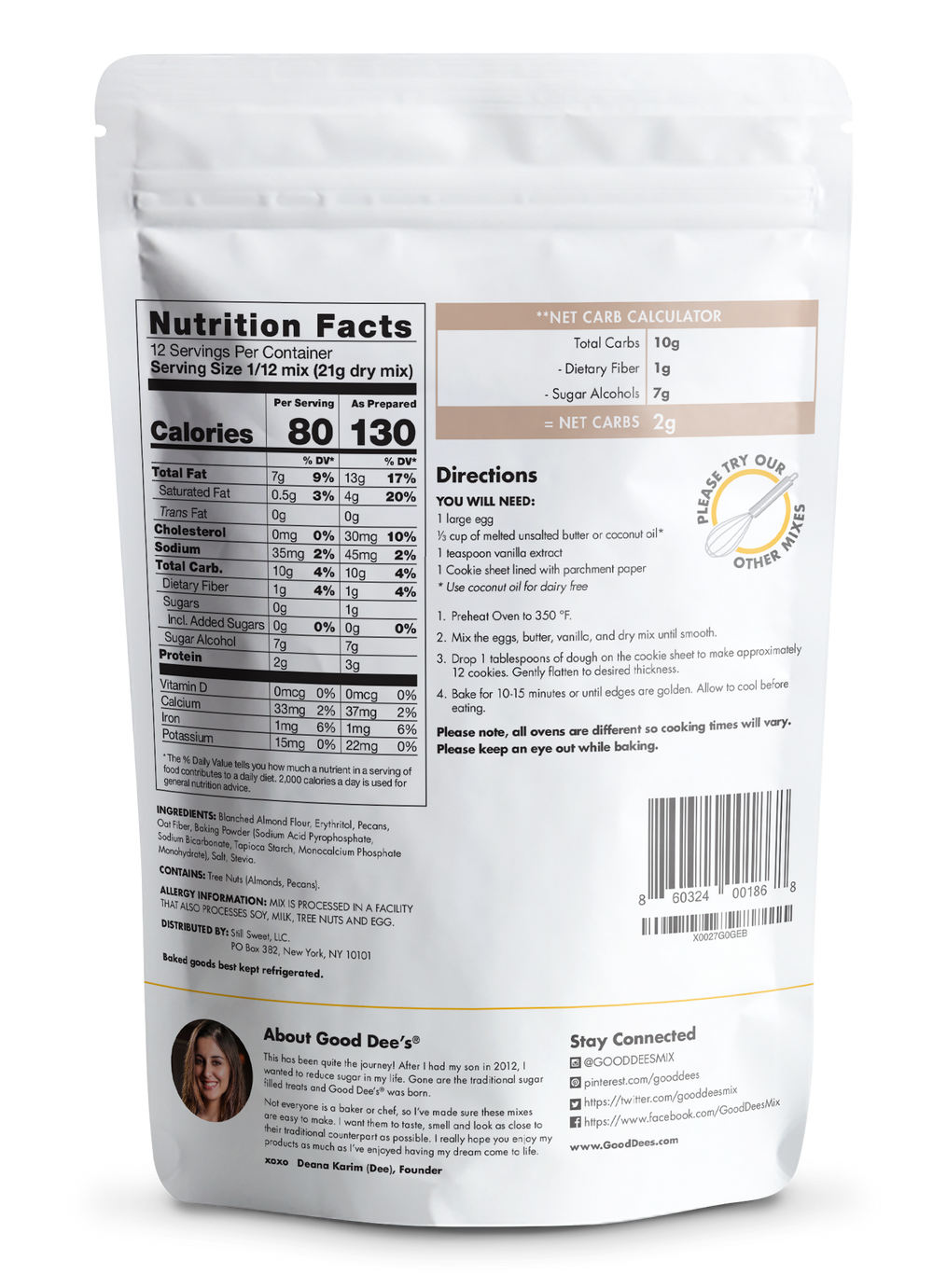 Good Dee’s Butter Pecan Cookies are 2g net carb per serving, no sugar added, wheat free and delicious. These soft, chewy cookies are perfect for any occasion. Whether you are trying to cut carbs, joining weight watchers, trying a ketogenic lifestyle or just being health conscious, Good Dee’s Butter Pecan Cookies will help you achieve your goals. Gone are the days of the forbidden cookie jar. You can enjoy these without the guilt.